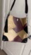 Tan, black, taupe and burgundy patchwork, mix of vegan/faux leather and leather and suede.