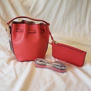 Sondra Roberts Squared drawstring bucket bag with wristlet and shoulder strap in coral with gold accents. Faux leather. Dimensions 7"H x 7"W x 5"D.