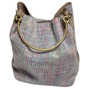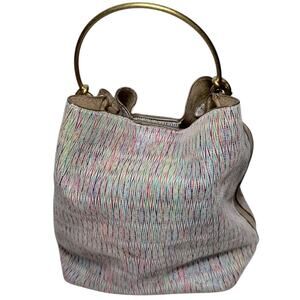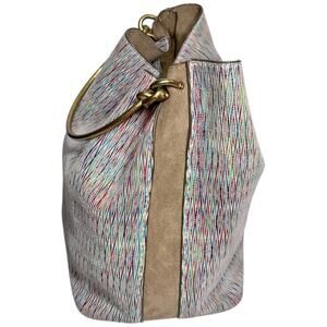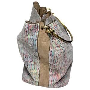 Sondra Roberts Pastel Multi Color Geo Print Leather Top Handle Attached Coin Purse Mini Bag. Metal top handle. Top magnetic closure.