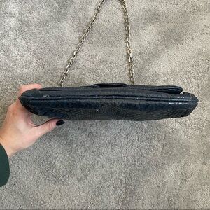 Lovely blue snake embossed convertible shoulder bag clutch from Sondra Roberts SR Squared. Has lovely silver tone stud detailing. Snap magnetic closure with multiple pockets and compartments. Minor flaking of material throughout with a ton of life left. Approximate measurements: 11” w x 7” h x 1.5” d x 11” strap drop. Inventory: bb*mteb
