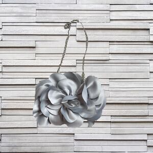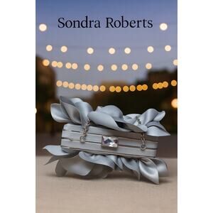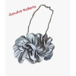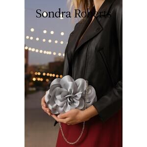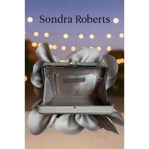 This lovely modern evening purse from Sondra Roberts features a hard shell base with fabric exterior shaped like large abstract flowers. Silver hardware. Top clasp is diamond like. Purse base measures about 6” x 3.5”. Used once. Excellent smoke free condition.