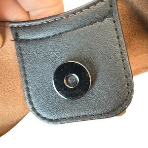 Black pebbled vegan leather with brown faux suede interior.