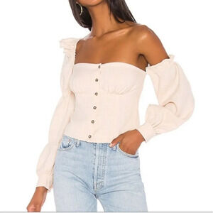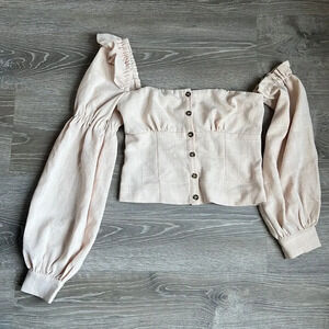 Self: 65% poly, 30% rayon, 5% elastane Lining: 100% rayon Hand wash cold Off shoulder styling elasticized sleeve Elasticized sleeve with ruffled trim Front button down closure
