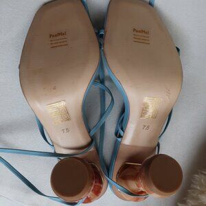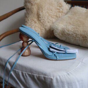 Leather upper with manmade sole. Imported. Ankle wrap with tie closure. Crossover straps. Leather lining. Square toe with stacked wooden ball heel. Approx 89mm/ 3.5 inch heel. Revolve Style No. SOSR-WZ69. Manufacturer Style No. SOSSH9 R19. Never Worn.