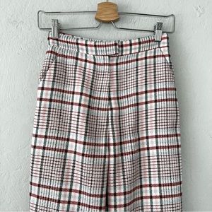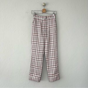 Beautiful pair of red and pastel plaid pants with a cropped straight leg and a high rise. Zipper fly, front pockets, lined.