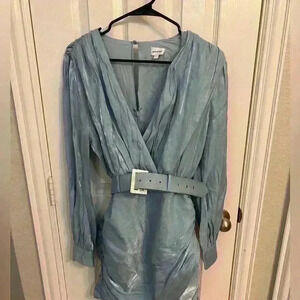 Song of Style Tucker Mini Dress in Clearwater Blue Medium. Features a shiny fabric, beautiful thick belt, zipper and button closure, ribbed sides and long sleeves.
