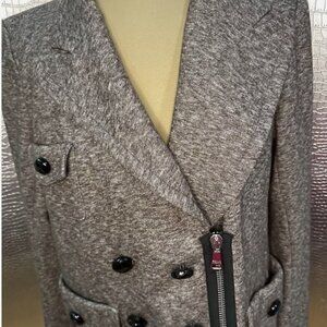 Sonia Rykiel was known for her work in cotton velour and for putting the seams on the outside of garments. Known as the "Queen of the Knits." This brown-gray jacket is military style, with off-center zipper and dark brown buttons. Made of wool, cotton, and polyamide. Size 44.