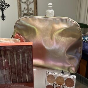 Sonia Kashuk set featuring an iridescent rose gold large dome case set. Includes eye brush set and Desert Lights eyeshadow palette.
