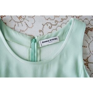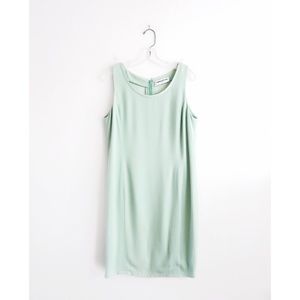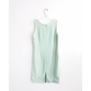Sonia Rykiel Tea Green Sleeveless Sheath Dress est. Medium 6 8, gently used--no rips, stains, or holes, scoop neck with satin trim, hidden back zip, princess seams, shift or sheath silhouette, straight hem with back vent, no size marked--please refer to measurements to ensure desired fit, estimated medium 6 8, no fabric content listed, feels like rayon/acetate blend, 12.75" across shoulders, 19.5" pit to pit, 17.75" across waist, 19.75-20" across hips, 38" shoulder to hem