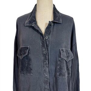 Super cool vintage shirt jacket. Thicker cotton pique fabric with corduroy details at the collar, placket and flap pockets at the chest.