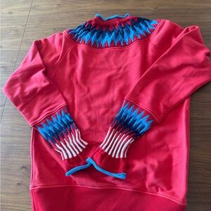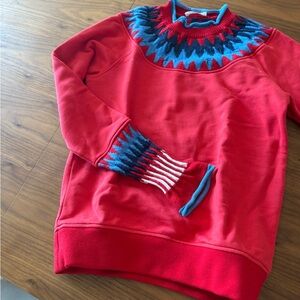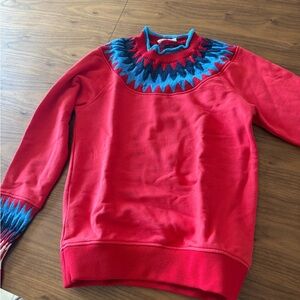 Bold red turtleneck with striking blue accents. Unique design by Sonia Rykiel. Perfect for a stylish look.