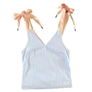 Pink Ribbon Tie Shoulder Sleeveless Tank top featuring Blue & white striped on one side and white eyelet on the other side.