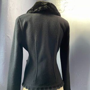 An elegant black, fitted, wool cardigan sweater by Sonia Rykiel. Fur collar affixed by buttons, and can be removed. Very good condition with one minor nick on the sleeve near the right shoulder (shown in picture). Size not listed, please see measurements.