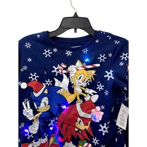 Add festive fun to your wardrobe with this Sonic The Hedgehog boys' holiday sweatshirt. Featuring a vibrant blue background with snowflake accents and a colorful Sonic the Hedgehog design, this sweatshirt lights up for an extra touch of holiday cheer. Made from a cozy cotton-polyester blend, it ensures comfort and warmth during the season.