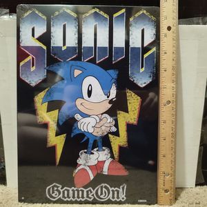 This is a brand new, factory sealed, official Sonic The Hedgehog/Sega metal tin wall hanging sign.