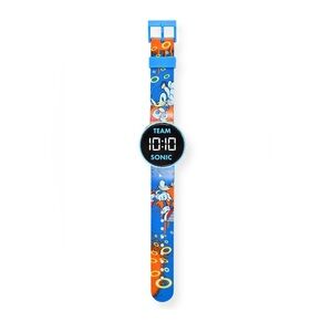 Sonic LED watch. Blue round metallic plastic case. Printed art on lens with digital readout. Printed art on plastic strap