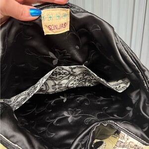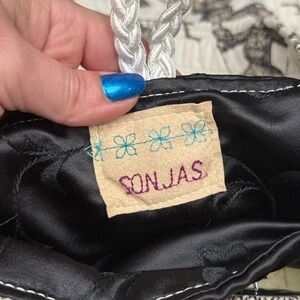 One-of-a-kind and full of charm, this handmade tote by Sonja’s features vintage-inspired toile print with intricate mixed-media appliqué, lace, and button detailing. Fully lined with satin floral quilting and a roomy interior pocket. Stylish, functional, and totally unique.