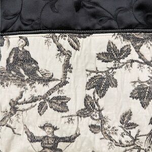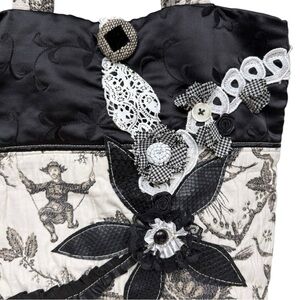 handmade tote bag, toile print bag, quilted shoulder bag, black and cream tote, artisan handbag, Sonja’s handmade, floral appliqué tote, large handmade purse, cottagecore style bag, feminine handmade tote, lace appliqué bag, one of a kind bag, romantic style tote, canvas and satin bag, vintage aesthetic bag