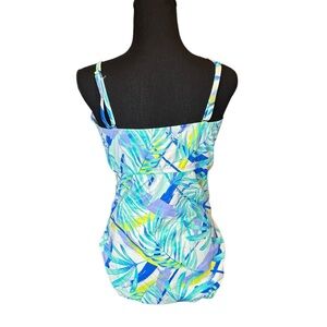 Stay stylish and confident in this vibrant Sonnet Shores one piece swimsuit in size 16. Features a flattering ruched front, supportive built-in cups, and adjustable straps for the perfect fit. The tropical palm leaf print in shades of blue, green, yellow, and white makes it perfect for beach days or poolside lounging.