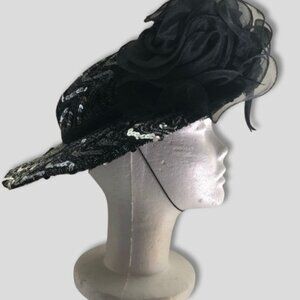 Sonni San Francisco Hat Vintage Sequin Beaded Lace Net Wide Brim Black/Silver OS