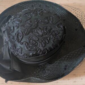 Popular in the 1940s and 1950s, this is a vintage black cocktail hat with a veil. These hats were a popular style for women including a rounded, flat-topped crown, an attached short, netted veil, sometimes referred to as a "birdcage veil," and is decorated with ribbons or flowers, as seen on the top and side of the hat. These hats are worn for various formal occasions, including weddings, parties, church gatherings and funerals.