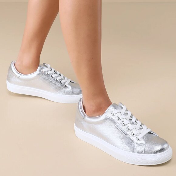 Casually dominate the top trends with every step in the D'Amelio Footwear Sono Silver Metallic Coated Twill Lace-Up Sneakers!