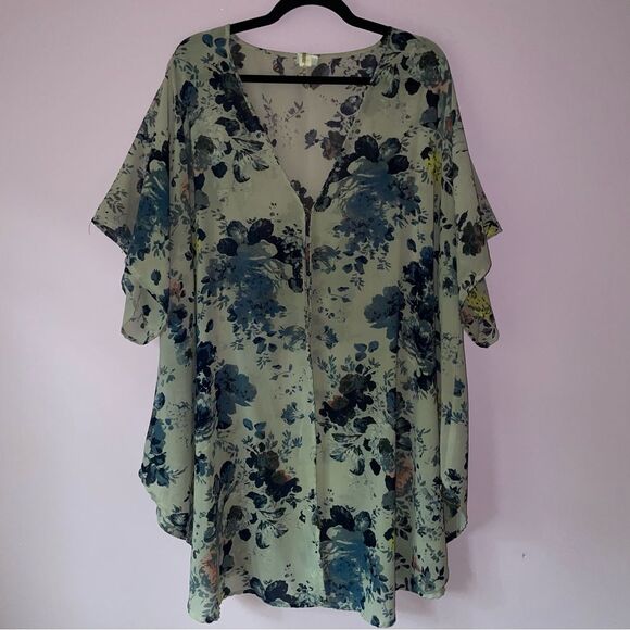 Sonoma 2X Sheer Cardigan Gray w Blue Floral Chiffon Longline Swim Kimono