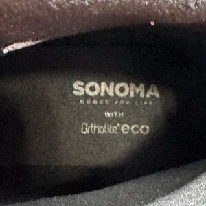 These are Sonoma women's hiking boots in size 9, featuring a black color with a plaid pattern. They are ankle boots with a lace-up closure and a bootie style. The upper material is textile, making them comfortable for outdoor activities. Perfect for those looking for stylish and functional footwear for hiking or everyday wear.