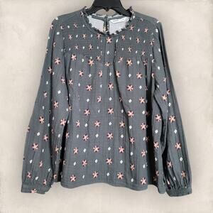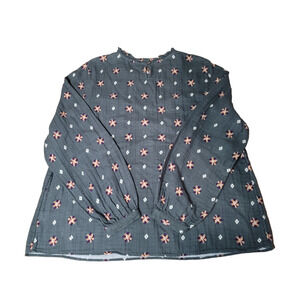 Sonoma Boho Green Teal Floral Print Peasant Blouse Ruffle Trim Crew Neck Blouse XL