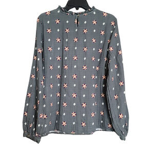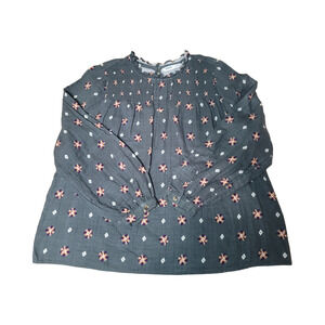 This is a cute and classic boho floral print peasant blouse by Sonoma. It features a ruffle trim crew neckline with a smocked front, long sleeves, and a cute keyhole design button closure in the back. This blouse is soft and comfortable, making it perfect for any season.