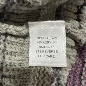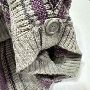 The Sonoma Cardigan Sweater in women's size M is a stylish and versatile piece perfect for various occasions such as travel, casual outings, and workwear. The gray and purple striped cable-knit design, belted short sleeves, and collared neckline add a touch of sophistication to this classic cardigan. Made from a blend of cotton and acrylic, this sweater is easy to care for with its machine washable fabric type. Ideal for all seasons, this cardigan features an open front and is accented with buttons, making it a practical and fashionable choice for any wardrobe.