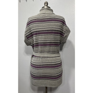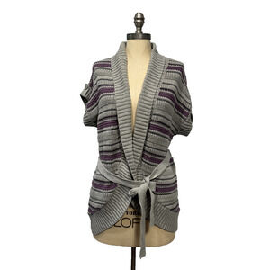 Sonoma Cardigan Sweater Womens M Gray Purple Striped Knit Belted Short Sleeve