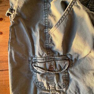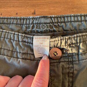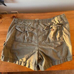 Forest green cargo shorts from Sonoma with cargo pockets and brown buttons. The tag will mention a belt but I bought it without one, so no belt included. Cargo material but very light and comfortable. #cargoshorts #greenshorts
