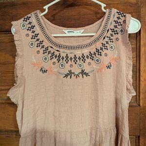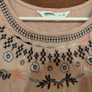 This charming mini sundress by Sonoma showcases a delightful sequin embellishment on a cream backdrop. Featuring a crew neck and short sleeves, it offers a casual elegance perfect for everyday wear. The lightweight fabric ensures a comfortable fit, making it an ideal choice for relaxed occasions.