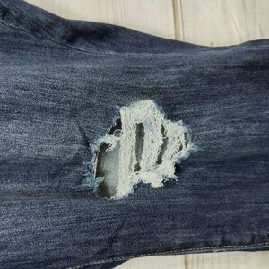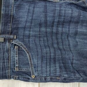 Excellent brand new condition, fitted through hip and thigh, skinny leg opening. Very nice darker wash, with distressing in the front at knees and front ankle hem.
