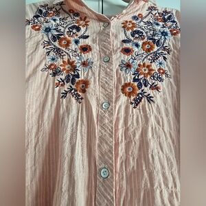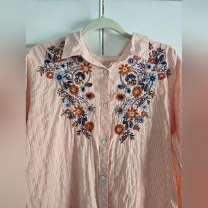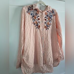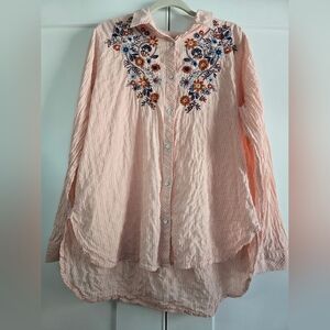 Chic and stylish pink blouse with intricate floral embroidery. Perfect for adding a touch of elegance to any outfit.