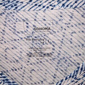Up for sale is a pretty and stylish Sonoma "The Everyday Tee" in women's size Large. This lightweight, short-sleeve V-neck shirt features an eye-catching blue and white abstract geometric print, perfect for adding a subtle pop of pattern to your casual wardrobe. This looks very nice in person and my camera just couldn't pick up the bright of the white with the contrast of the blue. But it really is sharp looking in person. It is made from a soft and breathable cotton-polyester blend so it's ideal for everyday wear, running errands, or simply relaxing in comfort. Thanks for looking!