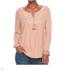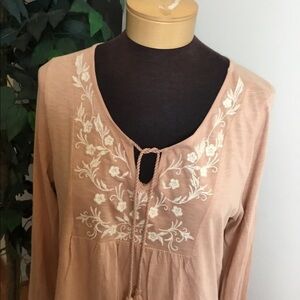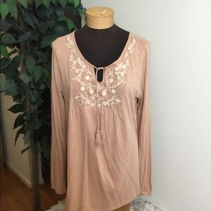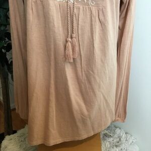 Sonoma Goods For Life peasant top L long sleeve keyhole front with fringe tie elastic on sleeve color is called rushmore rose tan with cream embroidered approximate pit to,pit 21 shoulder to hem 26