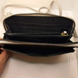 It has a credit card holder inside, a zippered pocket and another open pocket inside.