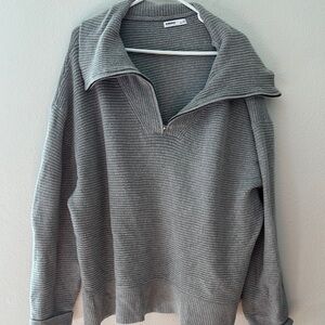 Cozy gray sweater with a half-zip collar. Ribbed texture. Perfect for layering.