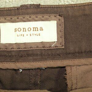These Sonoma Life Style Bermuda Shorts are a stylish and versatile addition to any woman's wardrobe. Designed in a classic mid-rise flat front style, these brown shorts are perfect for casual or travel occasions during the summer, fall, or spring seasons. Made of a comfortable cotton/spandex blend with a high rise waist and a 11-inch inseam, these shorts feature a zip and button closure, slash pockets, and are machine washable for easy care. Perfect for the modern woman looking for a blend of American classic and modern style.