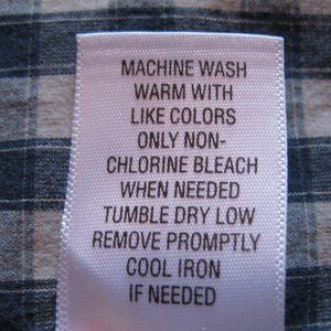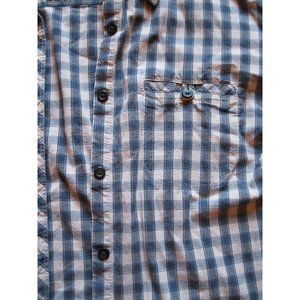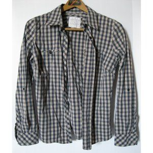 Sonoma brand, Life + Style long sleeved button down shirt. Dark blue and tan checked pattern. Sleeves have button strap about 2/3rds of the way down. Great for layering with tank tops or tee shirts.