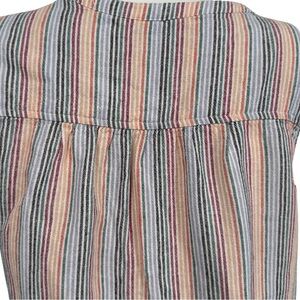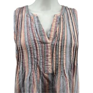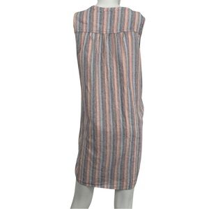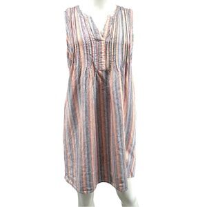 Sonoma Linen Blend Pin-tuck Tank Dress. Soft lineny feel with a little bit of weight to it so the breeze doesn’t catch you by surprise lol. A pocket on each side. Striped colors are burgundy, peach, orange, forest green, dark green and periwinkle on white background. Great for summer or for fall with a cute cardigan! Size medium petite. Happy to give measurements upon request!