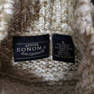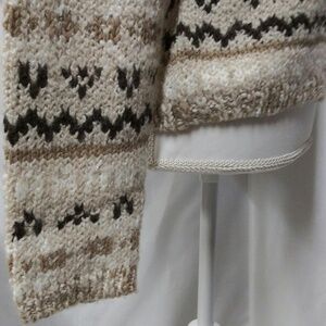 Sonoma Women's Brown/Tan/Cream Long Sleeve Knit Sweater. Geometric Design. 65% Acrylic, 30% Wool, 5% Other Fibers. Minor Pilling/Shedding Due To Wool. Measurements approx. Flat Lay. Pit to Pit: 19, Sleeve: 22.5, Length: 21.5 Size Small. Color May Vary Due To Lighting.