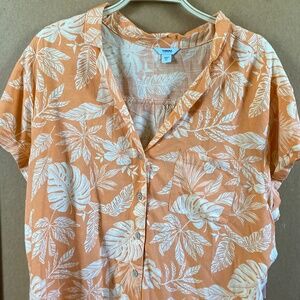 This is an XL Sonoma Top. It is orange with white leaf print. Buttons up the front with front breast pocket. 100% Rayon, made in India.