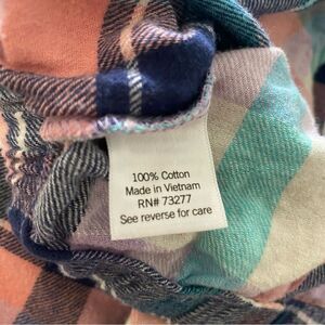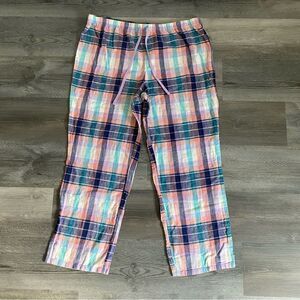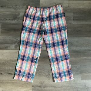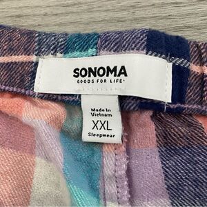 Relax in style with these comfy plaid pajama pants from Sonoma. The plaid is various colors of pink, peach, purple, blue aqua and white. Plus size XXL. Please see photo section for approximate flat measurements. Material: 100% cotton.