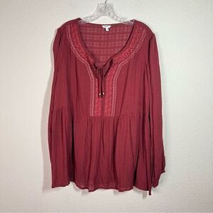 Sonoma Red Geometric Tie Neck Long Sleeves Pleated Top Women's Plus Size 1X