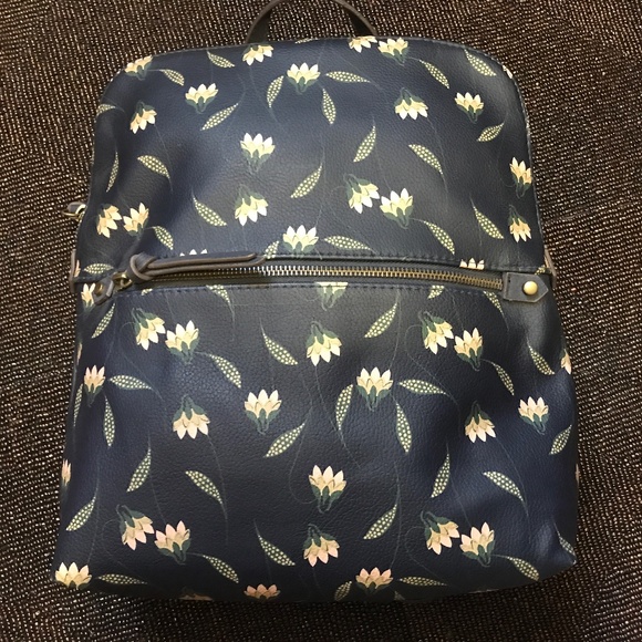 Navy Blue with flowers. Handle on top of bag, straps to wear on your back. Back straps are adjustable. Zippered pocket on back 5.5 inches wide, 6.5 deep. Front lower zippered pocket 8.25 inches wide, nearly 6 inches deep. This bag is 12.5 inches tall, 10 inches wide on gusseted bottom, 9.5 inches wide at the top while zippered. Has an inside lining and includes two top-open pockets on one side. On the other side, a zippered pocket. NEW