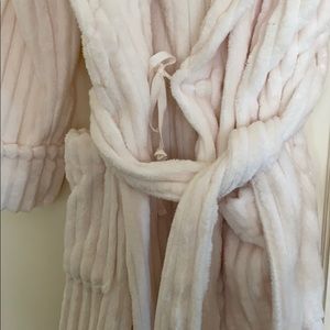 Super luxe and comfy plush robe, worn for about an hour. Inside tie as well as outside tie, 2 pockets. Would tidally keep if the gift giver hadn’t already given me 3 other similar robes in the past! 😂