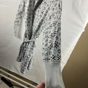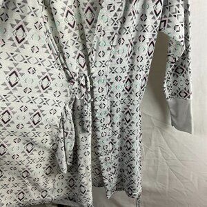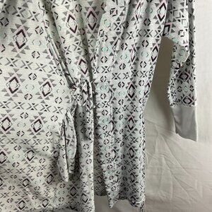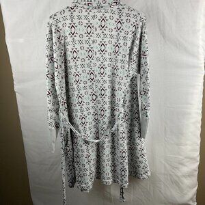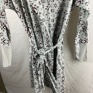 This super soft and cozy robe is perfect for relaxing at home. Featuring a chic geometric pattern in light gray, it has a comfortable tie waist and stylish cuffs for a perfect fit. Whether you're winding down after a long day or lounging in comfort, this robe has you covered! Great for any casual occasion, or as a gift for someone special.